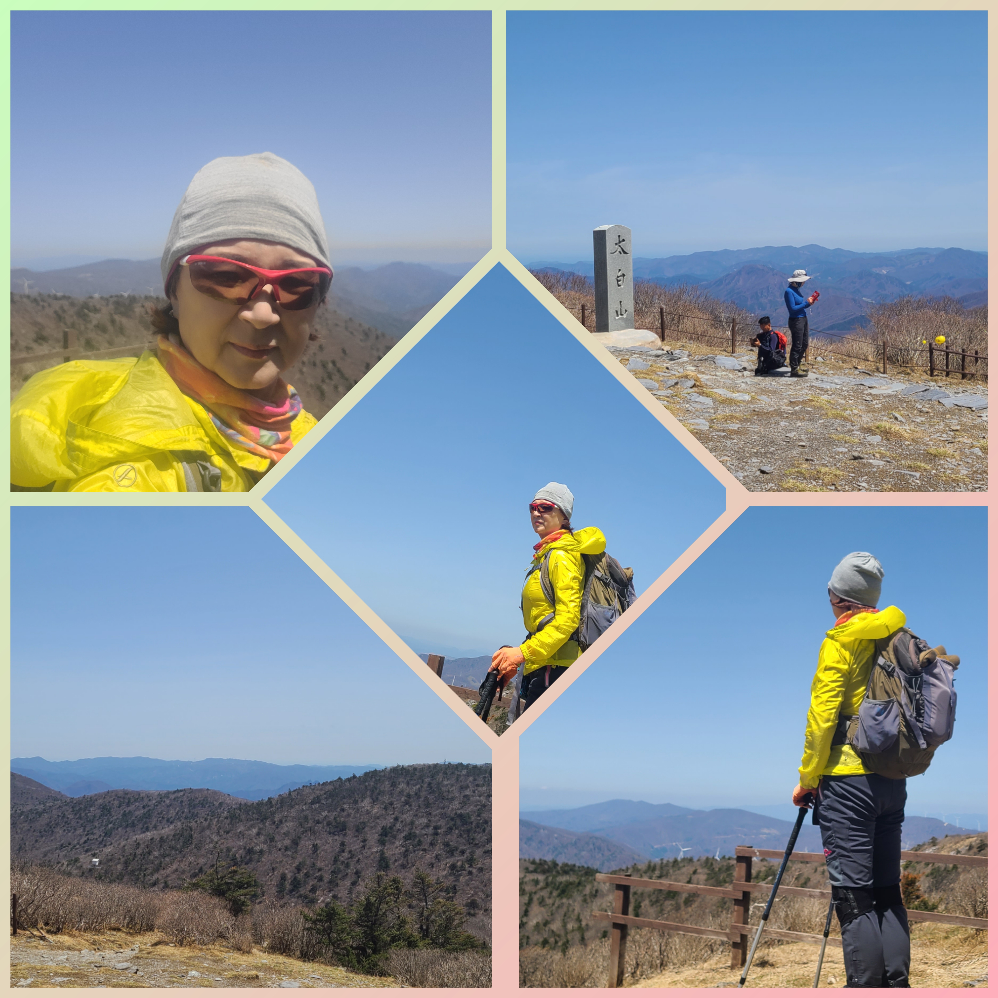 천제단, 산신님을 알현하고 바람을 피해 제단 옆에 자리한다. 싸온 김밥과 커피 한잔으로 허기를 채우며 내 위치를 폰으로 여기저기 알린다. 혼자 지내는 몸이기에 늘 행선지와 내 위치를 아이들한테 보내곤 한다. 칠십을 향해 나가는 나이지만 늘 씩씩하게 보내는 엄마 모습을 보여주기 위함이다. 이제 곧 밀어닥칠 초록이 기다려진다.