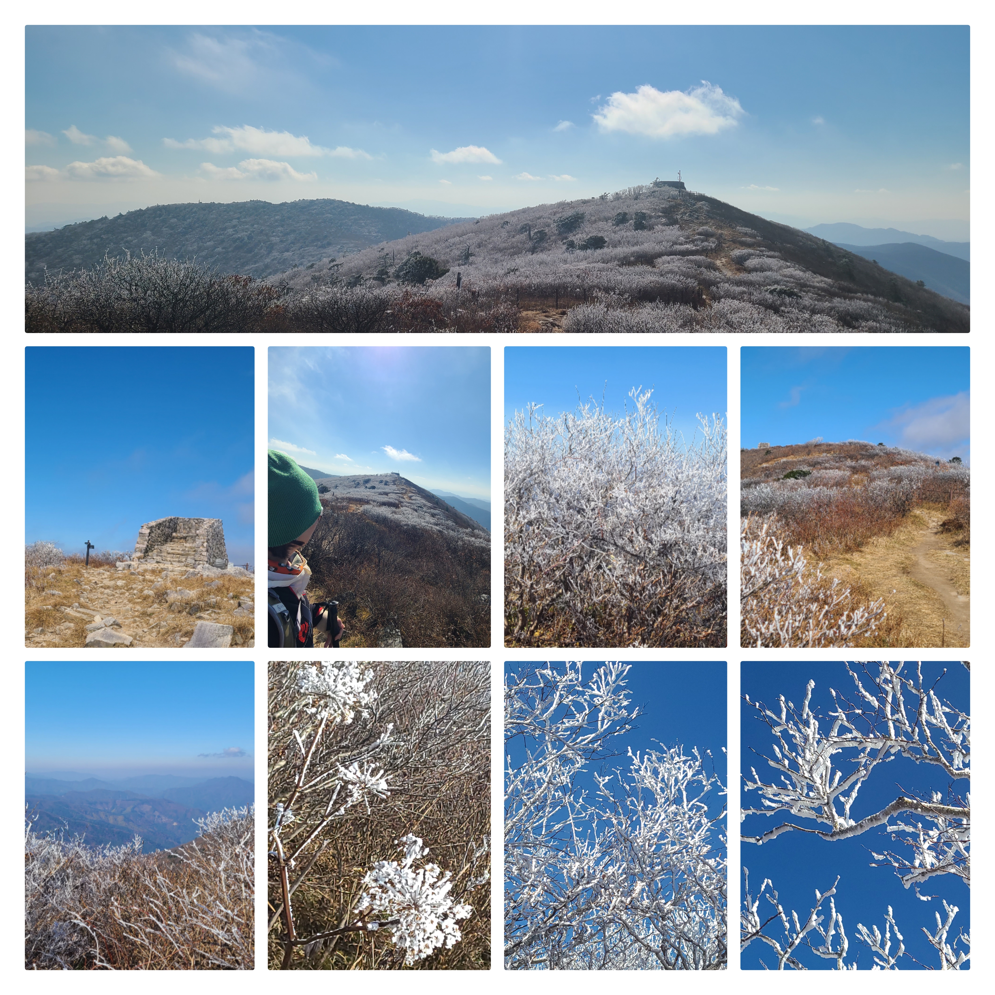 파란 하늘 아래 펼쳐진 서리꽃 풍경들이 점점 큰 그림으로 펼쳐지고 있는 산정이 광활한 산야를 거느리며 나를 기다리고 있었다.